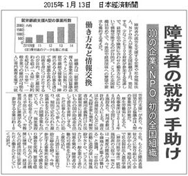 障害者の就労を支援する企業や福祉施設、NPO法人等から成る全国組織が、2月に発足する旨の記事が、日本経済新聞(2015年1月13日)に掲載されました。