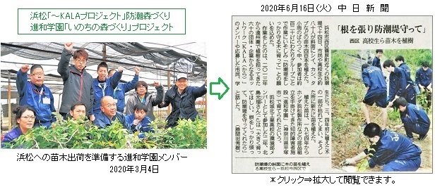 中日新聞「根を張り防潮堤守って/高校生ら苗木を植樹」(2020.6.16)