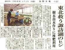長野日報「東北救う諏訪湖のヒシ/樹木苗木作りに堆肥利用」(2013.1.1)