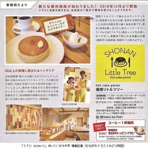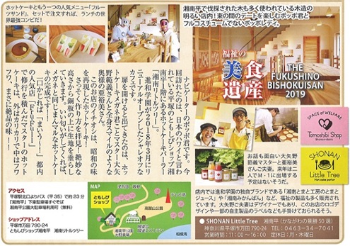 ホットケーキ・パーラー湘南リトルツリーの紹介記事が、公益財団法人神奈川県福利協会の機関誌「福利かながわ」(2019年新年号)に掲載されました。同協会は、神奈川県下の民間社会福祉事業従事者の福利増進を図り、その生活安定の方途を講じ、もって県下の社会福祉活動の進展に資することを目的としています。