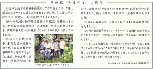 今から半世紀前、1965年(昭和40年)頃、進和学園では地元の湘南平において、障害のある方達と職員が協力してヤマユリの栽培に励んだ経緯があります。財団の機関誌「ミドリ」に、「かなユリ・チャレンジ」の進捗報告と合わせ、進和学園の出縄雅之理事長による「県の花“やまゆり” に思う」という随想が掲載されました。