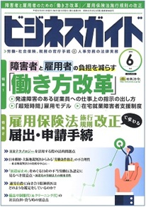 社会保険、税務、人事・労務の実務専門誌「ビジネスガイド」No.855 2018年6月号(日本法令)に、研進の出縄貴史による「在宅就業障害者支援制度 」に関する解説記事(P.19~26)が掲載されました。同誌の「働き方改革/障害者と雇用者の負担を減らす」の特集の中で執筆依頼を頂いたものです。