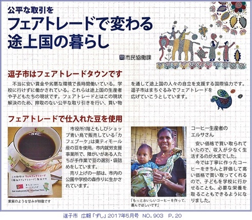 フェアトレード商品を取り扱う各種マーケットや啓発事業等、様々な企画が実践されていますが、私達が手掛ける東ティモール産コーヒー「カフェ・ブーケ」もご推挙頂いています。逗子市の広報「ずし」(2017年5月号)にも関連記事が掲載されました。