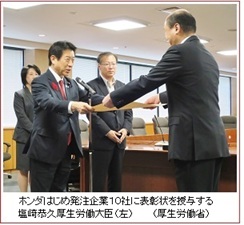 第1回表彰対象となった10社の中でも、発注額(調達額)が際立つ本田技研工業(株)の事例を挙げ、企業等における障害者の直接雇用に加えて、雇用が難しい障害者の自立就労支援策として、特例調整金(報奨金)の支給や、「発注」ベースの場合も一定割合を障害者法定雇用率に加算する「みなし雇用」制度導入の提言にも触れています。