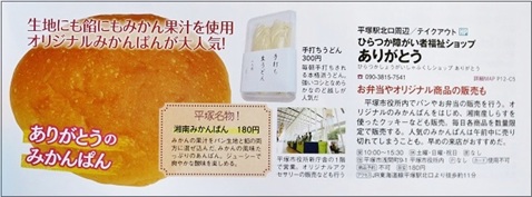 「湘南みかんぱん」は、全国逸品セレクションの準グランプリに輝いた逸品で、ひらつか障がい者福祉ショップ「ありがとう」(平塚市役所新庁舎1階)の人気商品として掲載!「人気のみかんぱんは、午前中に売り切れてしまうことも。早目の来店がおすすめだ」とのコメントが付されています。(P.50)