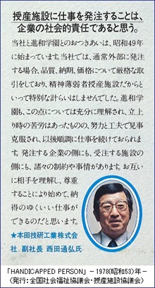 本田技研工業 西田通弘副社長(当時)の「授産施設に仕事を発注することは、企業の社会的責任であると思う」とのコメントが30年以上前のものであることに驚かされます。