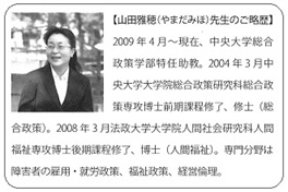 中央大学総合政策学部助教の山田雅穂先生による掲題論文(日本経営倫理学会誌第20号)は、「ISO26000とインクルージョンの観点から」との副題にもある通り、企業による障害者の直接雇用の拡充に加えて発注促進による福祉的就労の底上げも含めて、現状分析と課題を論じていま山田雅穂先生略歴hp.jpgす。特に、発注促進策に係る先行研究や議論が少ない中で、発注促進策を社会的責任を果たすための社会的投資と位置付け、インクルージョンを条件とした制度設計を提言しています。