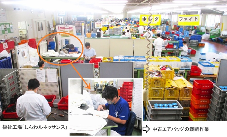Hondaグループの商社である(株)ホンダトレーディング様のご紹介により、クーヤデザイン様からの作業の請け負いが実現しました。進和学園が手掛けるのは、「サンメッセしんわ」のクリーニング部門が、中古エアバッグの洗浄を行い、その後に「しんわルネッサンス」にて生地の裁断作業を担っています。