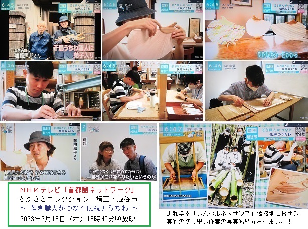 2023年7月13日(木)18時からのNHKテレビ番組「首都圏ネットワーク/ちかさとコレクション(埼玉・越谷市)」において、「若き職人がつなぐ伝統のうちわ」と題して藤田昂平さんの取り組みが紹介されました。