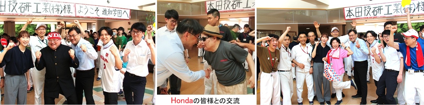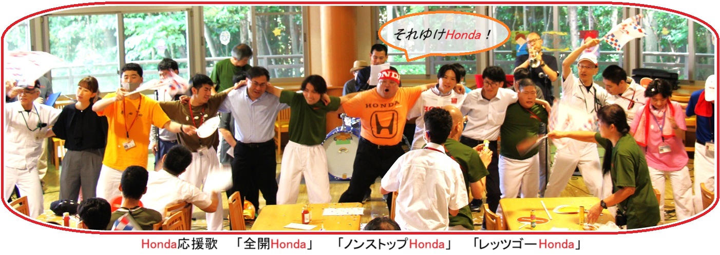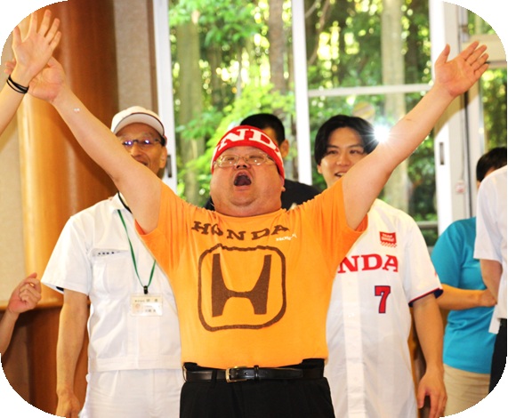 「しんわルネッサンス」では、昼食会に続いて、「とびっきりレインボーズ」(進和学園器楽同好会)のコンサートが組まれました。オリジナル曲「湘南みかんぱんロックンロール」に続いて、Honda応援歌が披露されると拍手喝さい!皆でスクラムを組んで謳い上げHonda様との一体感に包まれました!
