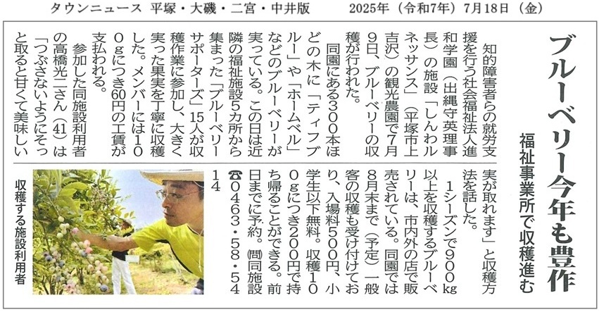 タウンニュースでは、連携する福祉施設「ブルーベリーサポーターズ」が協力して摘み取り作業を行い工賃に還元されていること、進和学園メンバーへのインタビューを含めて、摘み取りの事前予約を受け付けていることも紹介しています。夏休みの思い出づくりとしても最適です。