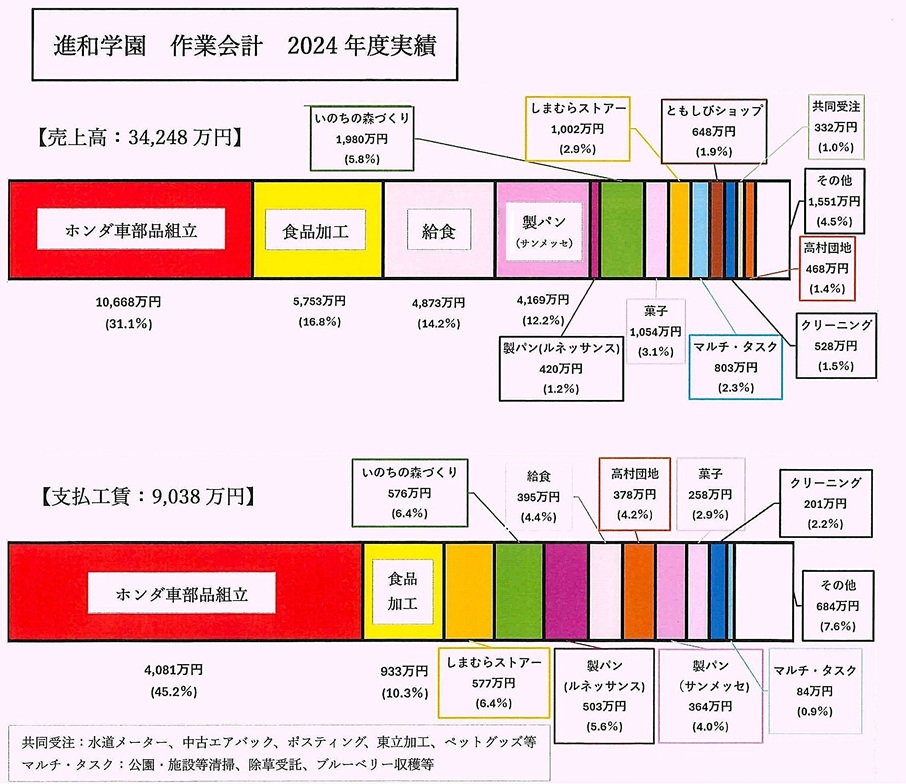 私達は、環境変化に対応すべくホンダ車部品事業を中心に据えつつ、作業種の多角化に取り組んでいます。2024年度決算における進和学園の作業会計(売上高・支払工賃)実績を、ご参考までご案内申し上げます。