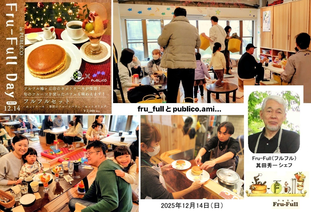 2025年12月14日(日)、NPO法人子育て支援グループamigoさんが運営するPUBLICO梅ヶ丘において、特別企画の「フルフルデー」が開催されました。ホットケーキパーラーFru-Full(フルフル)の其田秀一シェフを招聘して、ホットケーキ&フルーツパフェを賞味できるチャンスです。