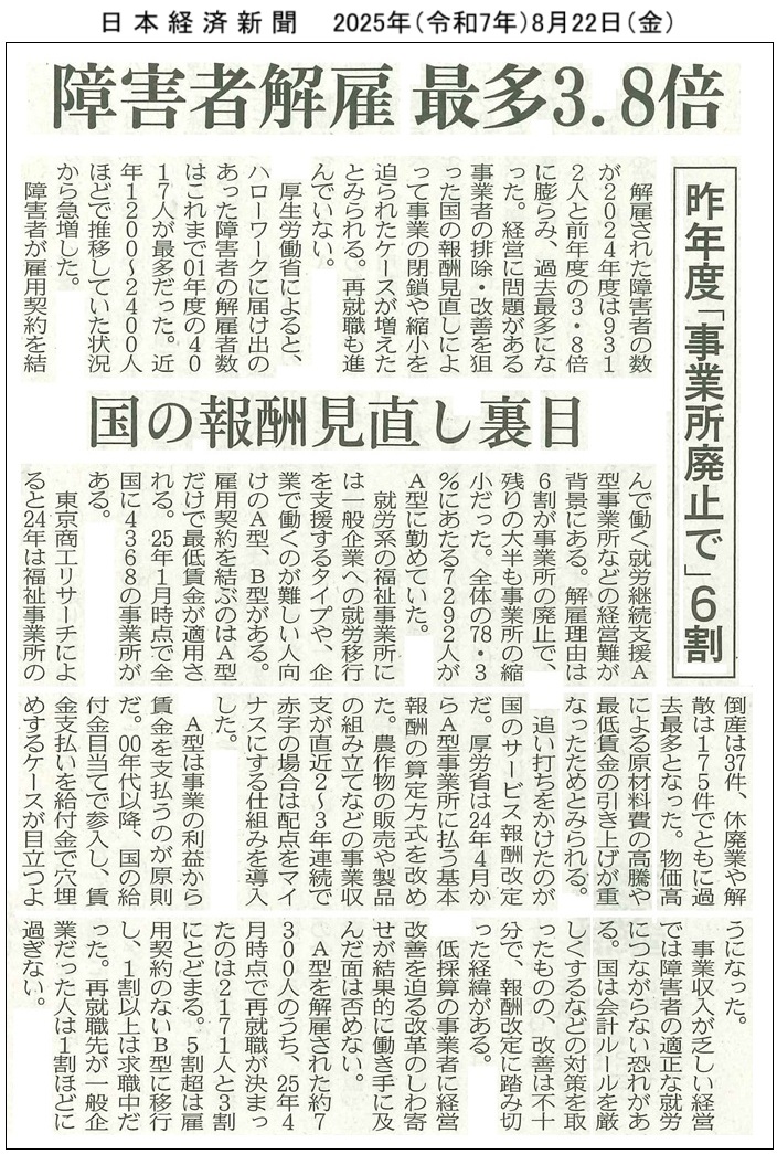 2025年8月22日付「日本経済新聞」において、「障害者解雇最多3.8倍/昨年度『事業所廃止で』6割」との記事が掲載されました。