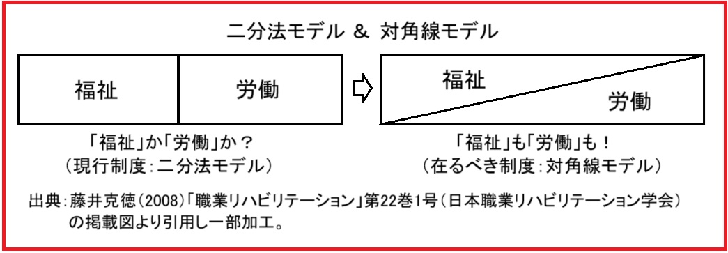 嘗て、藤井克徳氏(日本障害者協議会)が「二分法モデル」と「対角線モデル」(「職業リハビリテーション」第22巻1号:日本職業リハビリテーション学会)を示して、「福祉」と「労働」の連携の必要性を指摘されましたが、残念ながら両者の連携は殆ど進んでいないのが実情です。