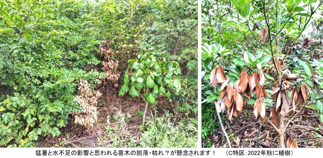 特に、植樹してから数年が経過し順調に生長していた樹木が枯れ始めている箇所が散見されるという、これまでに経験したことのない状況が認められます。一端、葉を落としても根が生きて入れば再萌芽も可能であり、見守りたいと思います。