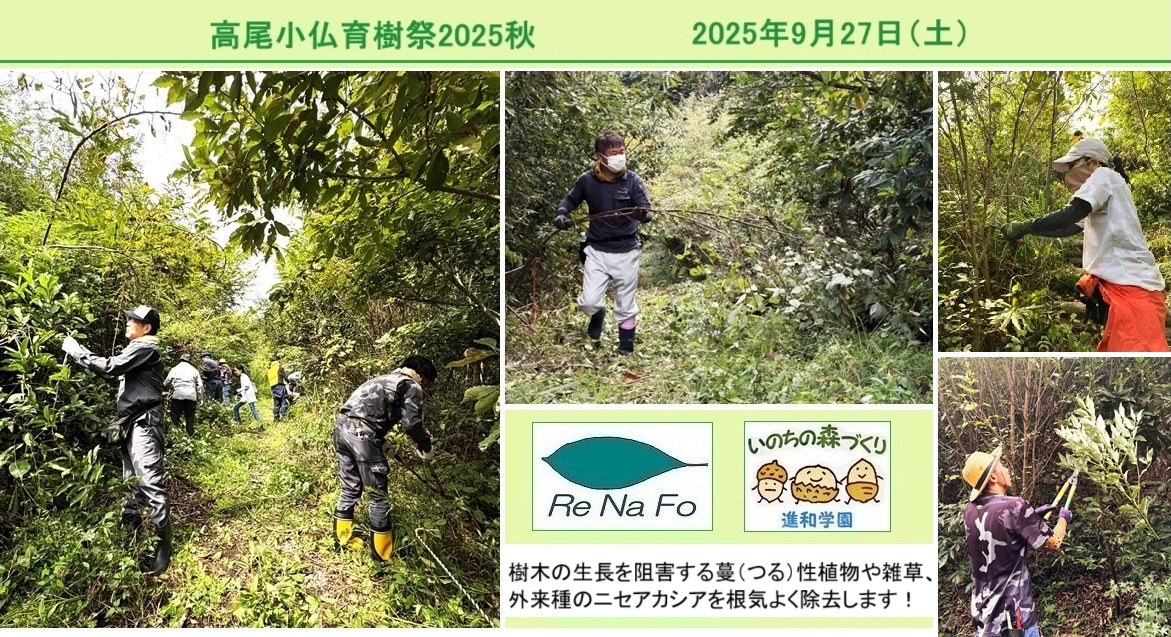 2025年9月27日(土)、「高尾小仏育樹祭2025秋」に参加しました。主催者のNPO法人国際ふるさとの森づくり協会(レナフォ)、レナフォの植生工学士にボランティア、土地を所管される中日本高速道路(株)(NEXCO中日本)の皆様をはじめ47名が集いました。進和学園いのちの森づくり友の会も協力者として名を連ね、学園&研進からも7名が参加。皆様と交流をしながら、爽やかな汗を流しました。