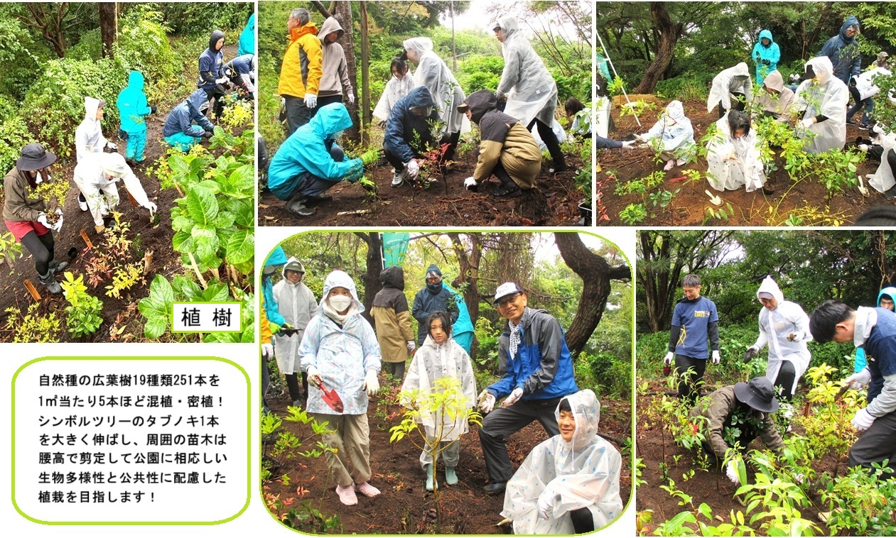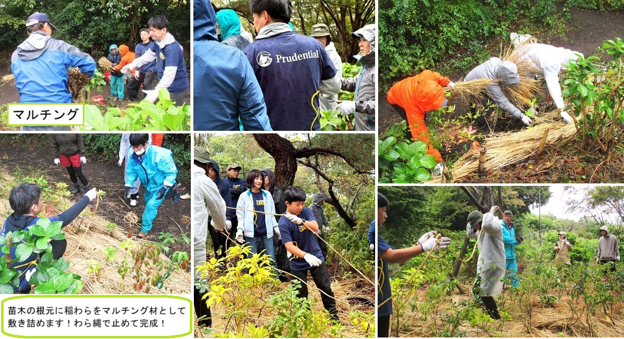 この日は、秋雨前線の影響で全国的に雨模様でした。あいにくの霧雨状態でしたが、PGF生命の社員・ご家族の皆様20名が参加下さり、進和学園(どんぐりグループ)メンバーと交流を図りながら、力を合わせて苗木を植えました。通路際の混垣植栽と「アジサイ園」の内側に、シンボルツリーのタブノキとその周りを囲む混植・密植の植栽を合わせ、2ヶ所に自然種の広葉樹19種類合計251本を植樹しました。