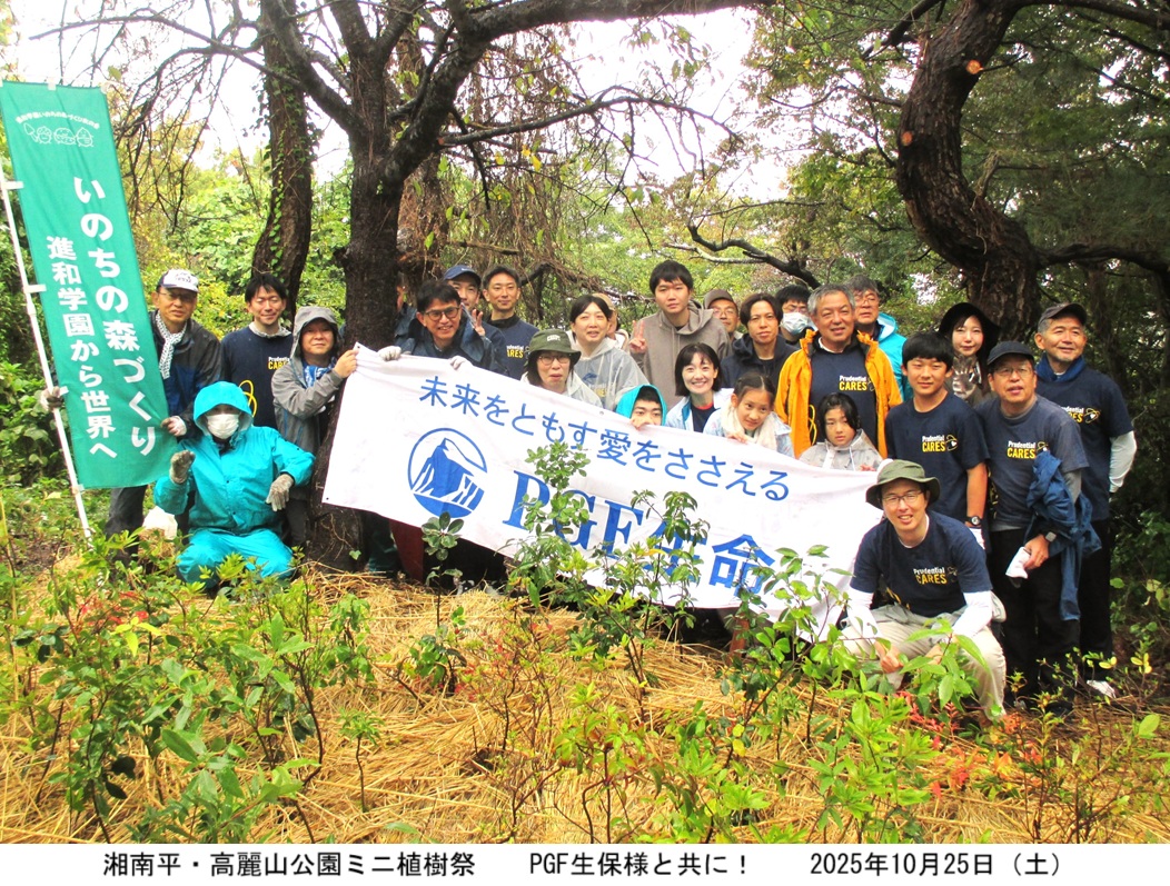 2025年10月25日(土)、第1回目のミニ植樹祭を実施しました。有難いことに、植樹に要する費用は、PGF生命(プルデンシャルジブラルタファイナンシャル生命保険)(株)様からの「いのちの森づくり友の会」基金へのご寄付を活用させて頂けることとなりました。同社には、2019年から7年連続でご寄付を賜り、昨年までは高尾小仏植樹活動に参加頂きましたが、高尾小仏での植樹が一段落したことから、今年は、湘南平での植樹をご案内申し上げたものです。