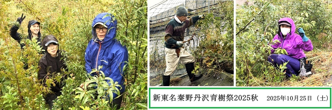 2025年10月25日(土)、新東名高速道路の丹沢スマートICアクセス(神奈川県秦野市戸川)に集合!2021年12月、道路斜面に「ふるさとの木によるふるさとの森づくり」を目指して36種類3,394本を植樹した場所です。自然の森を育み環境と防災に活かす取り組みですが、植樹地の除草及び蔓性植物を除去する「育樹祭」が行なわれました。あいにくの小雨模様にも拘わらず、23名が集い作業に励みました。