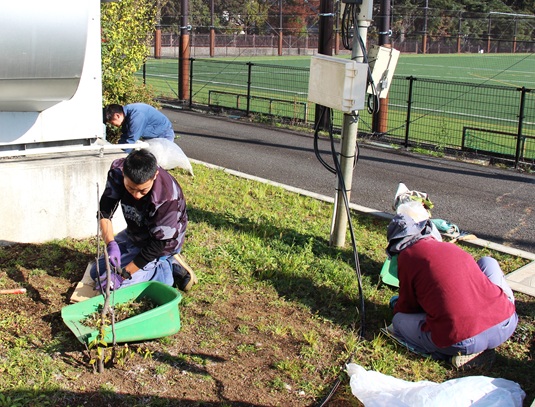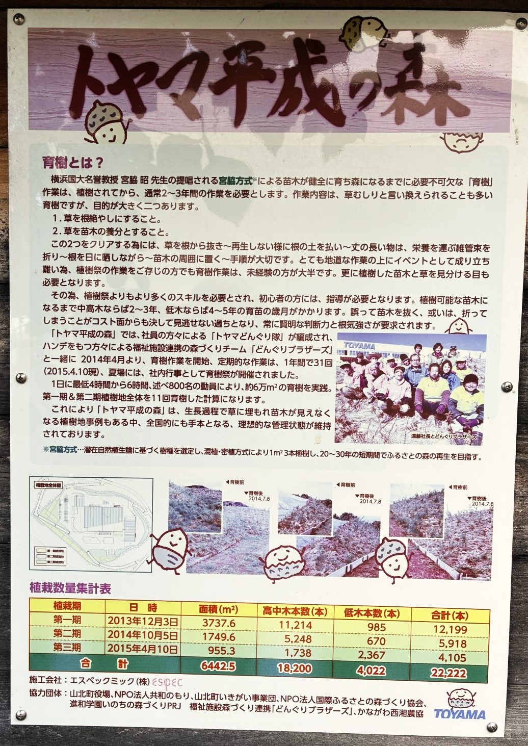 自然の森ではなく、人と共生する緑化を目指し、一部に芝生地や見栄えを意識した植栽も行っています。進和学園(しんわルネッサンス)の「どんぐりグループ」が担当し、遣り甲斐を感じながら充実した日中活動に励んでいます。
