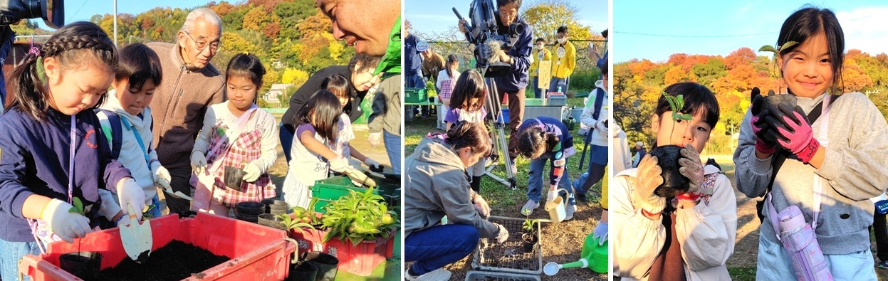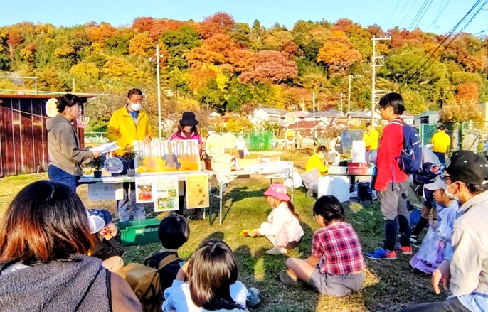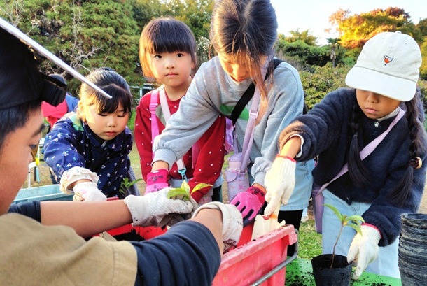 2025年11月24日(月・祝)、神奈川県中郡二宮町の東京大学果樹園跡地において、「野外で遊ぼう!2025」が開催されました。二宮町子ども会育成会連絡協議会が主催し、近隣の小学生約110名が参加して、焚火パン、竹とんぼ、その他ワークショップを楽しみました。私共の「いのちの森づくり」プロジェクトにもお声掛けを頂き、一連のワークショップが終了後の15時から、「ポット苗づくり」の体験イベントを実施させて頂きました。