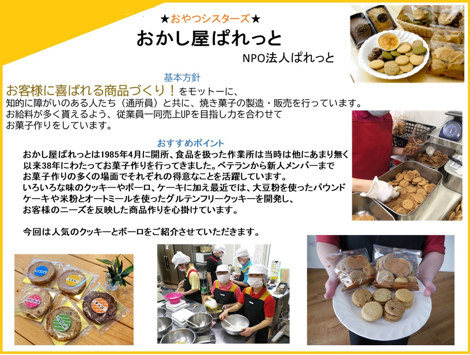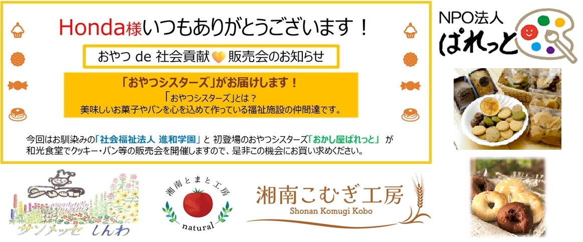 今月は、「おやつシスターズ」の連携福祉施設からNPO法人ぱれっと(おかし屋ぱれっと)(東京・恵比寿)さんに初登場頂きました。同施設の焼菓子は、何れも品質も高く美味しいものばかりです。Honda青山本社ビルの社員食堂における販売コーナー「おやつで社会貢献」でもお馴染みでしたが、今回、和光ビルの皆様にもご案内申し上げることとなりました。