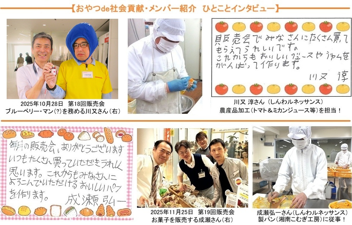 今春、青山本社ビルの建替えにより、同ビル1階のMILES Honda Cafe及び社員食堂における「おやつで社会貢献」(常設コーナー)も終了となりましたが、和光ビルにおいて、販売会を毎月開催させて頂いていることは大変有難く、皆様のご理解とご協力の賜です。明年も、一同で力を合わせて取り組んで参りますので、宜しくお願い申し上げます。