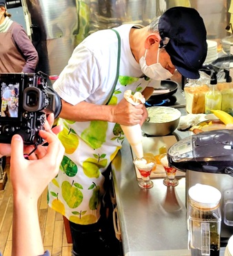 写真右:SNSの取材を受けるFru-Full(フルフル)の其田秀一シェフ