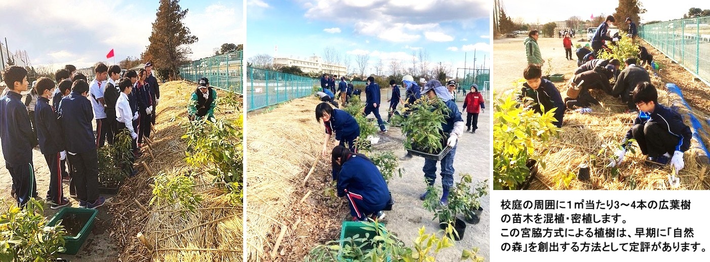 2026年1月24日(土)、同校で苗木25種類350本(注)の植樹が行なわれました。中学1年~高校1年の緑化委員の生徒さん14名にボランティアの皆さんも参加して、「宮脇方式」(混植・密植)による植樹を体験しました。通常は、苗木を植えた後に、根元にマルチングとして稲わらを敷き詰めますが、冬季ということを踏まえ、稲わらによるマルチングを予め施し、地温を10度程に保った上で植えることとしました。