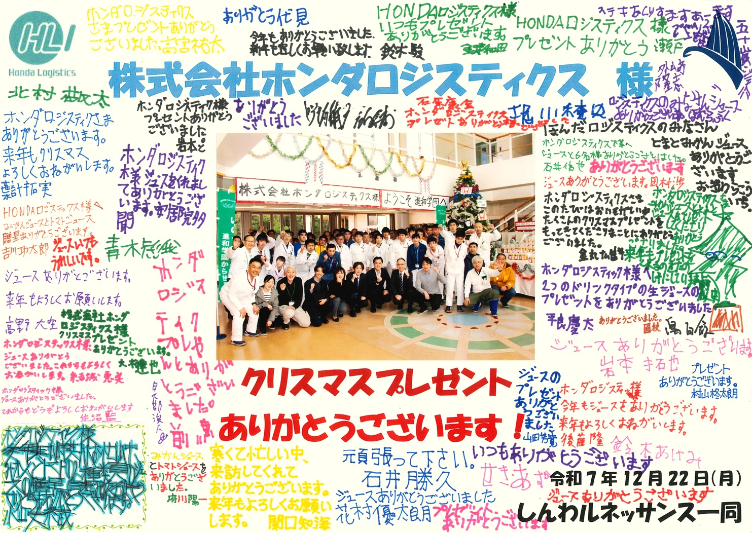 2026年1月29日(木)、Hondaグループの物流中核会社である(株)ホンダロジスティクス様の本社(東京・半蔵門)を訪問させて頂きました。同社には、私達が組み立てた自動車部品のHonda様各製作所への輸送及び納入代行をお願いし、迅速かつ安全・的確なサービスをご提供頂いています。本業に加えて、進和学園自主製品のご利用、並びに学園が推進する「いのちの森づくり」プロジェクトに対しても多大なご支援を賜っています。