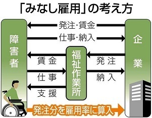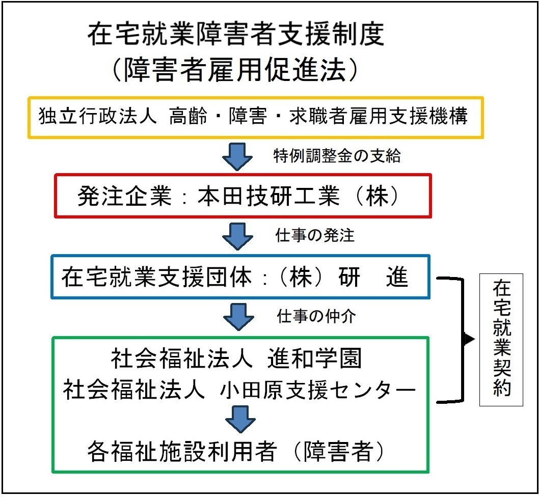 弊社は、1974年以来、進和学園の営業窓口会社としてHonda様から受注している自動車等の部品組立を中心に、障害のある方々に仕事を仲介しています。福祉的就労現場からの問題意識を踏まえ、制度・施策への提言にも微力を注いでいますが、特に、企業への発注奨励策として可能性を有す「在宅就業障害者支援制度」に注目しています。自宅に加え福祉施設等へ仕事を発注する企業に対して、障害者雇用納付金制度から特例調整金・特例報奨金が支給される制度です。